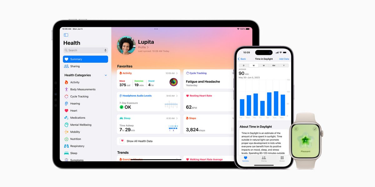 Новые функции психического здоровья позволяют пользователям регистрировать свои мгновенные эмоции и ежедневное настроение, видеть ценную информацию и легко получать доступ к оценкам и ресурсам. iPhone, iPad и Apple Watch предлагают новые функции для здоровья зрения, которые поощряют здоровый образ жизни и помогают снизить риск близорукости, а также Приложение для здоровья приходит на iPad, предоставляя пользователям новые способы просмотра данных о своем здоровье. Все эти новые функции — и существующие функции для здоровья — основаны на научных данных и построены на принципах конфиденциальности.