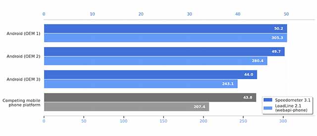Google заявила, что Android в связке с Chrome представляет собой самое быстрое решение для просмотра веб-страниц. Такой вывод компания сделала на основе двух бенчмарков — Speedometer и LoadLine. С их помощью можно определить отзывчивость интерфейса и скорость загрузки контента.