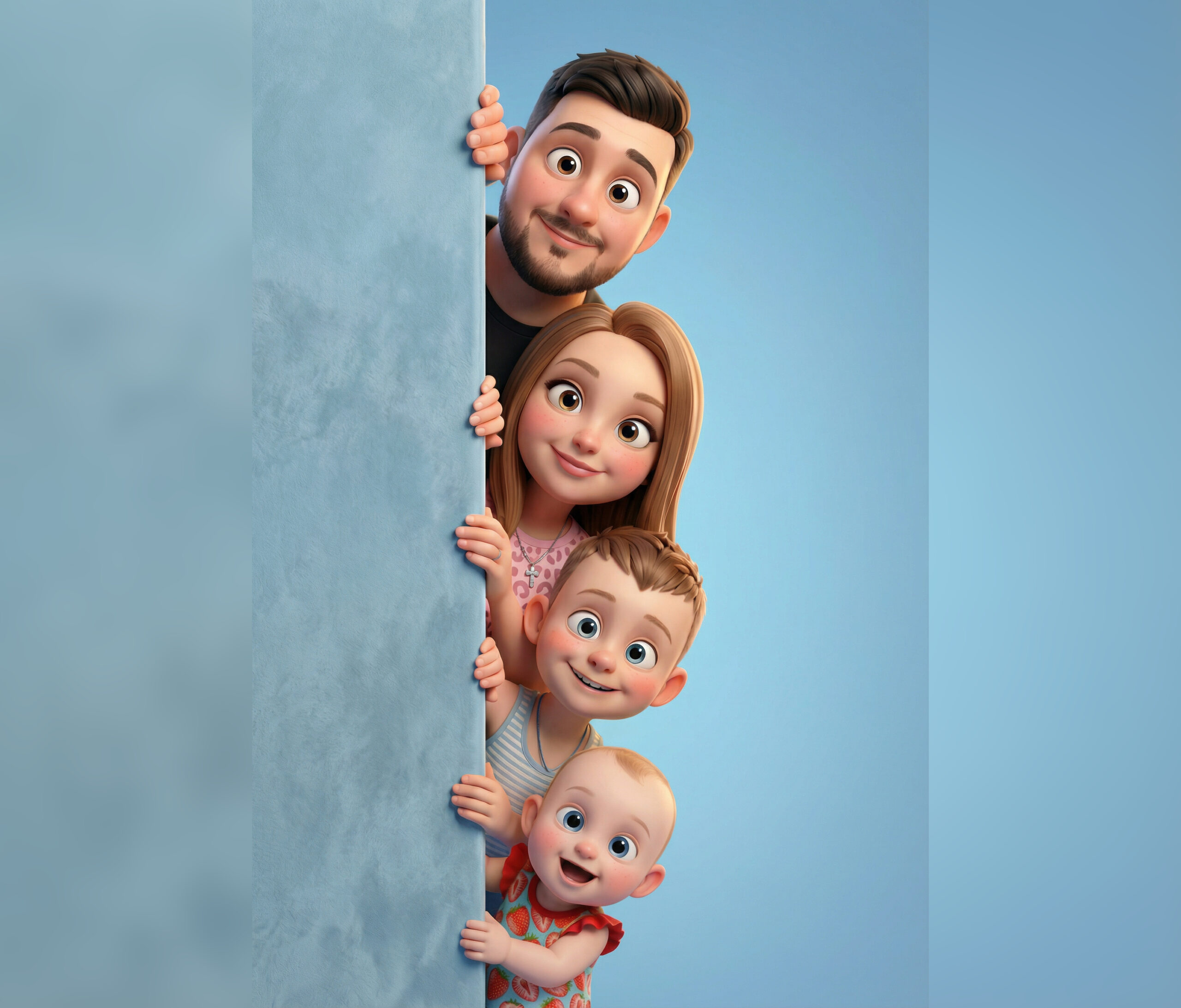 Создайте качественную 3D-стилизованную мультяшную иллюстрацию по загруженным эталонным фото мужчины, женщины, одного ребенка-мальчика, второго ребенка-девочку, подглядывают из-за вертикальной матовой стены слева, видимы только головы, руки и верхние торсы, уложенные вертикально, под другой в чистой выровненной вертикальной линии, как бы прячется и игриво выглядывает; композиция мягкая фактурная пастель, небесно-голубая стена на переднем плане слева и гладкий фон студийный градиент в небесно-голубом тоне справа; стиль должен быть мягким анимированным премиум-классом Pixar / Disney-style с большими выразительными глазами, гладкой безупречной кожей, тонким румянцем, увеличенные пропорции головы для очаровательного кинематографического ощущения, сохраняя все черты лица, прически и возраст по эталонным фото; оба персонажа мягко держат стену руками и слегка наклоняется вперед с любопытными игривыми выражениями; освещение должно быть мягким студийным освещением с теплыми нежными подсветками и без резких теней; материалы включают бархатистую матовую текстуру стены, мягкую ткань и гладкую кожу; общее настроение должно чувствовать себя уютным, быть вертикальным портретом с центрированным обрамлением и неглубокой глубиной поля; окончательный рендер должен быть ультрачистым 4К в стиле Octane / Unreal / Disney CGI.