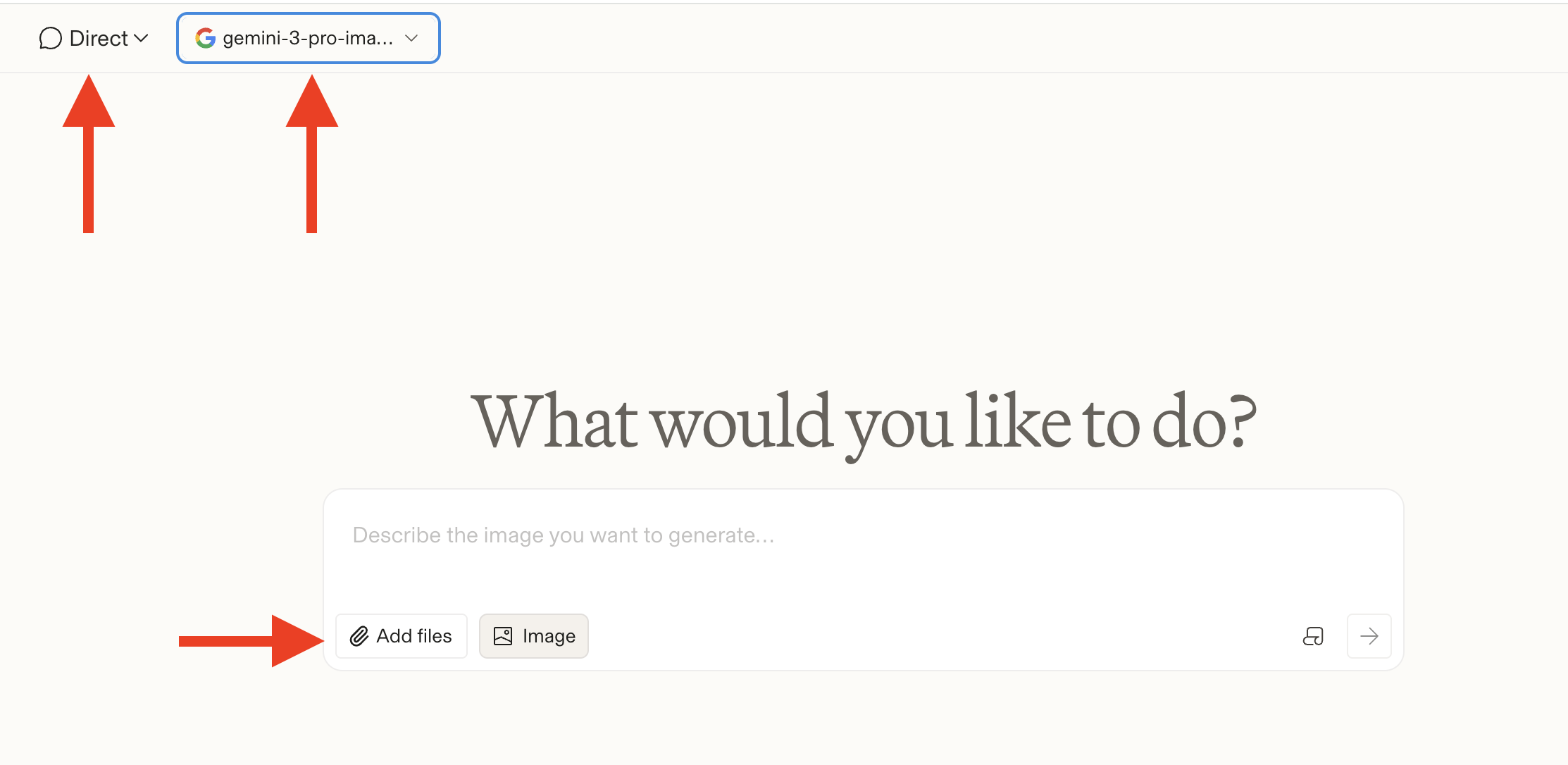 - Переключитесь в режим Direct и выберите: gemini-3-pro-image-preview-2k (nano-banana-pro).