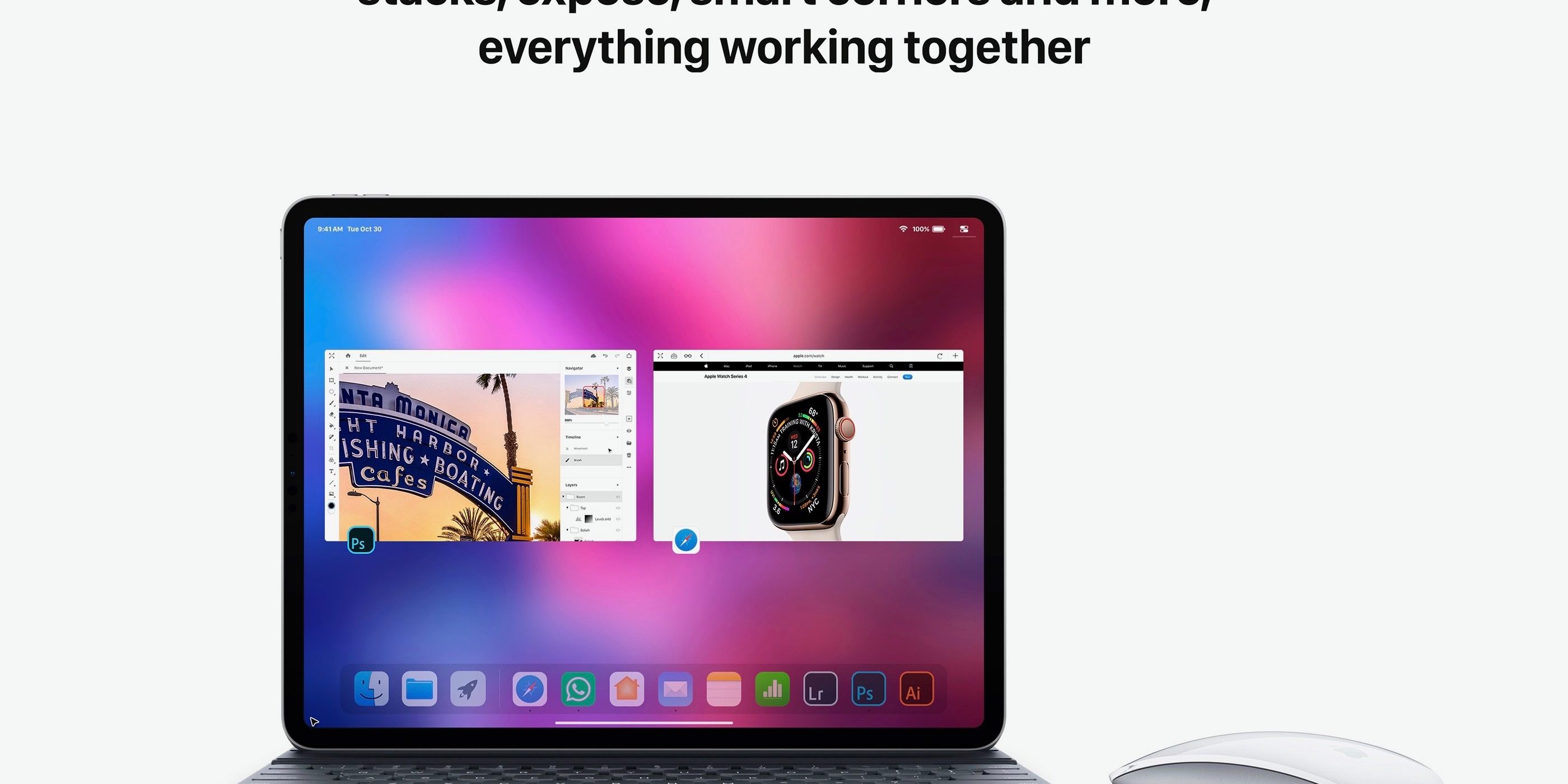 Использование мыши и трекпада даст пользователям возможность использовать дополнительные жесты для управления гаджетом и новые способы переключения между приложениями. По мнению автора концепта, должен обновиться и внешний вид Центра Управления. Одним из нововведений, по задумке дизайнера, станут умные углы. Они позволят перетащить файл или окно в угол экрана iPad и одновременно использовать разные приложения.