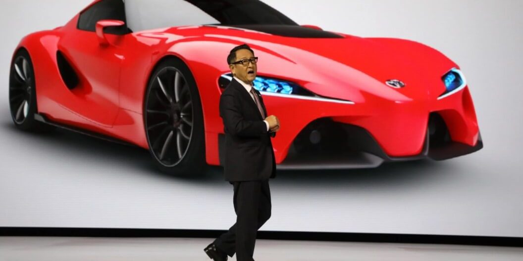 Глава Toyota Акио Тоеда (Akio Toyoda) на фоне изображения будущего автомобиля