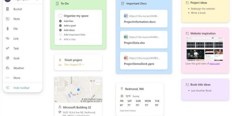 Клиенты могут создать новое пространство с нуля или использовать шаблон, предоставляемый Microsoft. Оказавшись внутри пространства, пользователи могут щелкнуть «Ведро», чтобы создать организационный «ящик» и добавить в него контент.