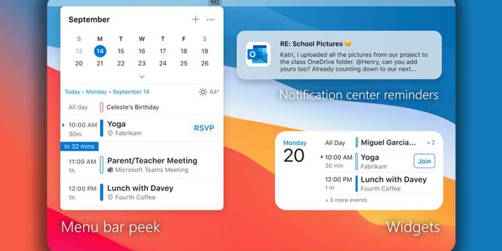Outlook для Mac — это не просто порт версии для Windows, хотя многие элементы интерфейса являются общими для разных платформ, включая папку «Входящие» и жесты смахивания. Microsoft оптимизировала Outlook специально для macOS, предусмотрев встроенную поддержку Apple Silicon и специфических для Mac функций, таких как Handoff to iPhone, виджеты календаря и напоминания в Центре уведомлений. Microsoft также заявляет, что «создает предварительный просмотр предстоящих событий календаря в строке меню», который скоро появится в приложении.