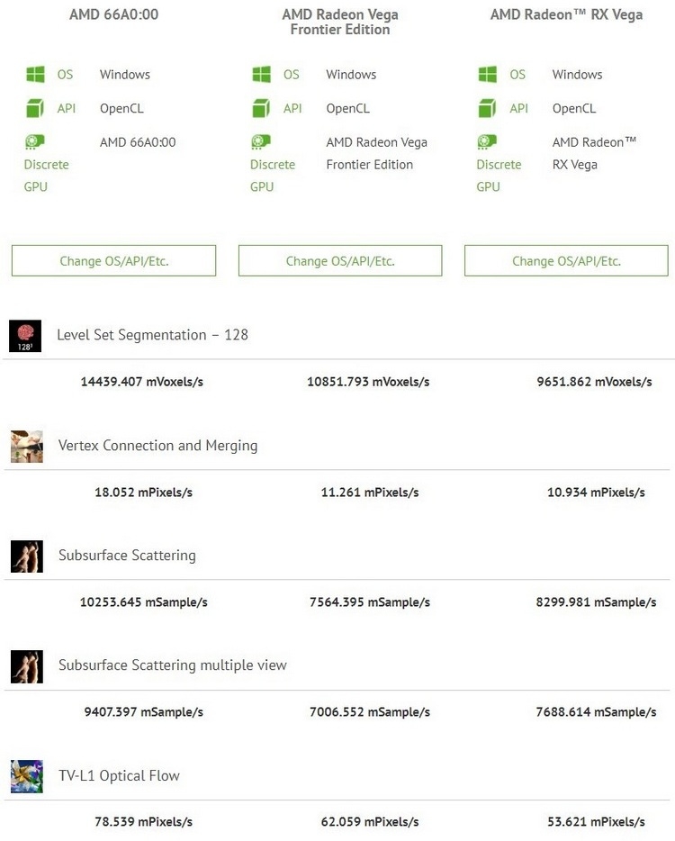 Если в различных играх видеокарты на графических процессорах AMD Vega не способны продемонстрировать выдающийся уровень производительности, то в различного рода вычислениях они вполне уверенно противостоят решениям конкурента. Поэтому компания AMD и решила выпустить обновлённую версию графического процессора Vega специально для вычислений и уже тестирует её. Во всяком случае, этот новый GPU был замечен в базе данных теста CompuBench. ![]() Новый графический процессор компании AMD известен как Vega 20, но здесь он упоминается под своим кодовым названием «66A0:0». Напомним, что компания AMD уже довольно давно объявила о работе над новым графическим процессором Vega, который будет производиться по 7-нм техпроцессу. Данный GPU станет основой будущего флагманского ускорителя вычислений Radeon Instinct, который должен выйти до конца текущего года. А вот шансы увидеть его в игровых видеокартах крайне малы. ![]() Согласно результатам тестов, в некоторых задачах новый графический процессор обеспечивает колоссальный прирост производительности по сравнению с нынешним Vega 10. Напомним, что этот GPU лежит в основе всех последних видеокарт AMD верхнего уровня, например Radeon RX Vega 64. Однако пользователи Reddit поспешили отметить, что им удавалось достичь и более высоких результатов в тестах CompuBench с помощью своих Radeon RX Vega 64. Поэтому преимущество новинки на самом деле может оказаться не столь значительным. ![]() Как бы то ни было, основные улучшения в Vega 20 по сравнению с Vega 10 произойдут за счёт перехода на новый 7-нм техпроцесс, так как больших изменений в самой архитектуре ждать не приходится. Данный переход должен обеспечить снижение энергопотребления, а также должен позволить увеличить тактовые частоты графического процессора. Кроме того, AMD может оснастить ускоритель Radeon Instinct на базе Vega 20 более быстрой памятью HBM2 с частотой 1250 МГц. Так что в целом новый Radeon Instinct имеет шансы оказаться довольно производительным ускорителем вычислений.