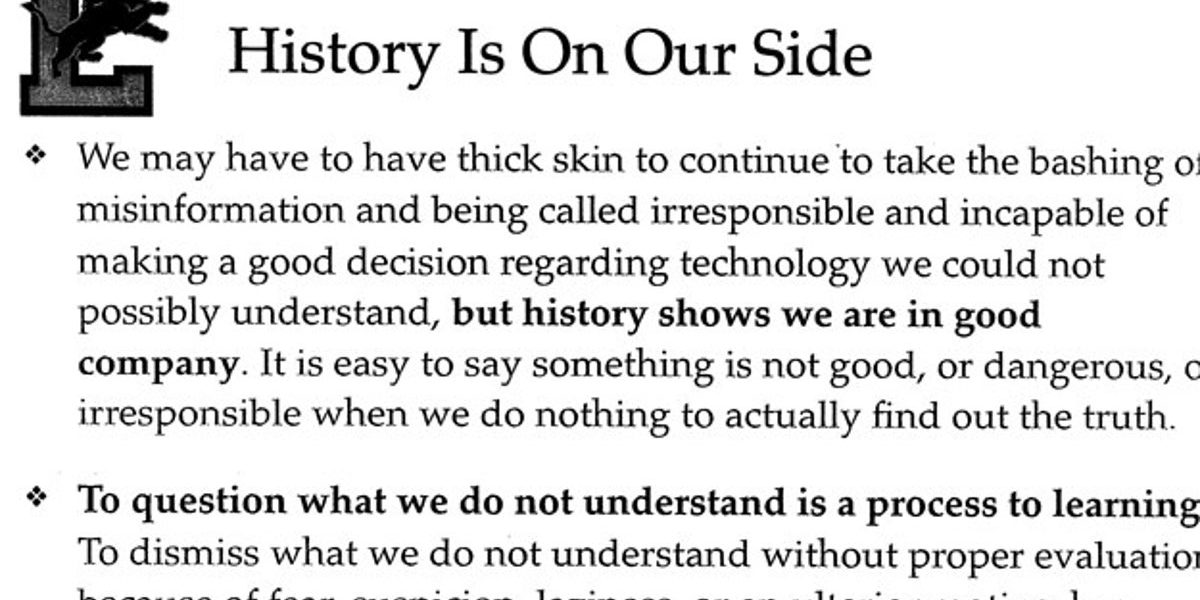 «Нам, возможно, придется иметь толстую кожу, чтобы продолжать противостоять дезинформации и быть безответственными и неспособными принять правильное решение в отношении технологий, которые мы не могли понять , но история показывает, что мы находимся в хорошей компании », — говорится в слайд-презентации, подготовленной школьным округом Локпорта. «Очень легко сказать, что что-то нехорошее, опасное или безответственное, если мы ничего не делаем, чтобы на самом деле узнать правду».