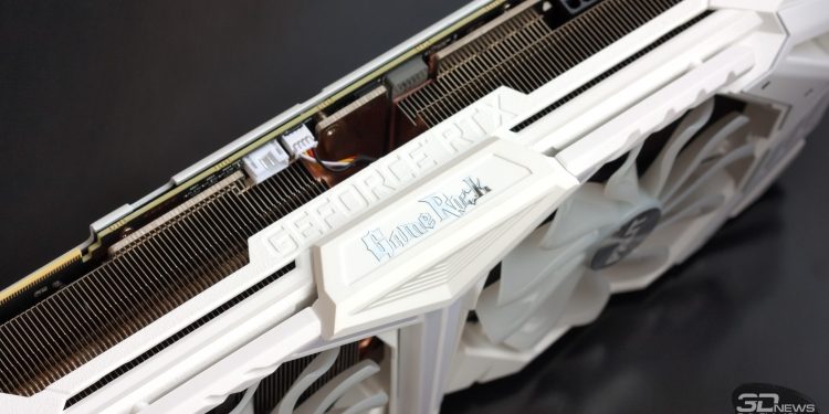 Вне зависимости от цвета кожуха и конфигурации RGB-светодиодов в конкретной модели RTX 2080 SUPER производства Palit, компоненты устройства отдают тепло двухсекционному радиатору, пронизанному пятью толстыми, 10-миллиметровыми теплотрубками. Кристалл GPU контактирует с ними посредством медной вставки, а для чипов GDDR6 и компонентов регулятора напряжения предусмотрены отдельные алюминиевые пластины. Задняя панель тоже сделана из металла, но в охлаждении платы не принимает никакого участия. Примечательно, что Palit отказалась от никелировки медных компонентов радиатора — это одна из причин, почему видеокарты Game Rock продаются по сравнительной низкой цене, но, естественно, не главная и, как мы увидим дальше, не единственная.