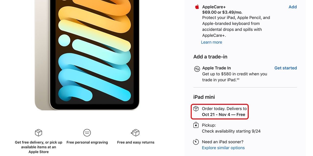 По данным интернет-магазина Apple Store, приобретенные сегодня модели iPad mini с Wi-Fi Space Grey, фиолетовый и 256 ГБ Starlight должны быть доставлены в период с 21 октября по 4 ноября. всех вариантов сотовой связи с 256 ГБ встроенной памяти также планируется прибыть в тот же период. Все розовые модели только с Wi-Fi, опция Starlight на 64 ГБ и все варианты сотовой связи на 64 ГБ появятся в период с 14 по 21 октября.