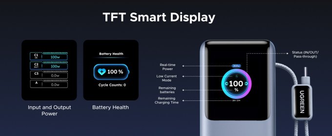 Компания Ugreen выпустила на рынке Европы портативный аккумулятор Nexode Pro ёмкостью 25 000 мАч. Новинка получила сразу два встроенных USB-кабеля и два USB-порта, а встроенный цветной дисплей позволяет отслеживать ключевые показатели работы в режиме реального времени.