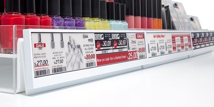 Пример использования электронных ценников на «широких» 30-см экранах E Ink (Japan Display Inc)