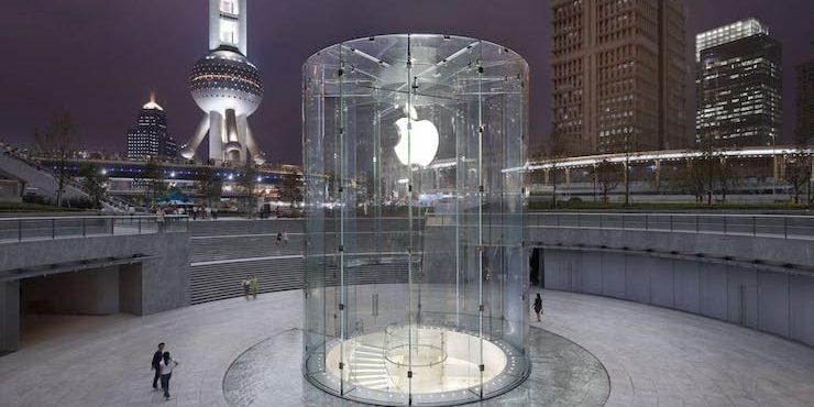 Одним из самых знаковых для компании Apple является ее шанхайский магазин. На его вершине расположен стеклянный цилиндр. Из него можно пройти в подземный внутренний двор, где и находится основная часть Apple Store. Компания даже получила патент на изогнутое стекло, которое и формирует тот самый цилиндр. Создавали эту красоту в Калифорнии, а в Китае просто осуществили сборку. В основе дизайна магазина в Шанхае лежат идеи Apple Store на Пятой Авеню в Нью-Йорке.